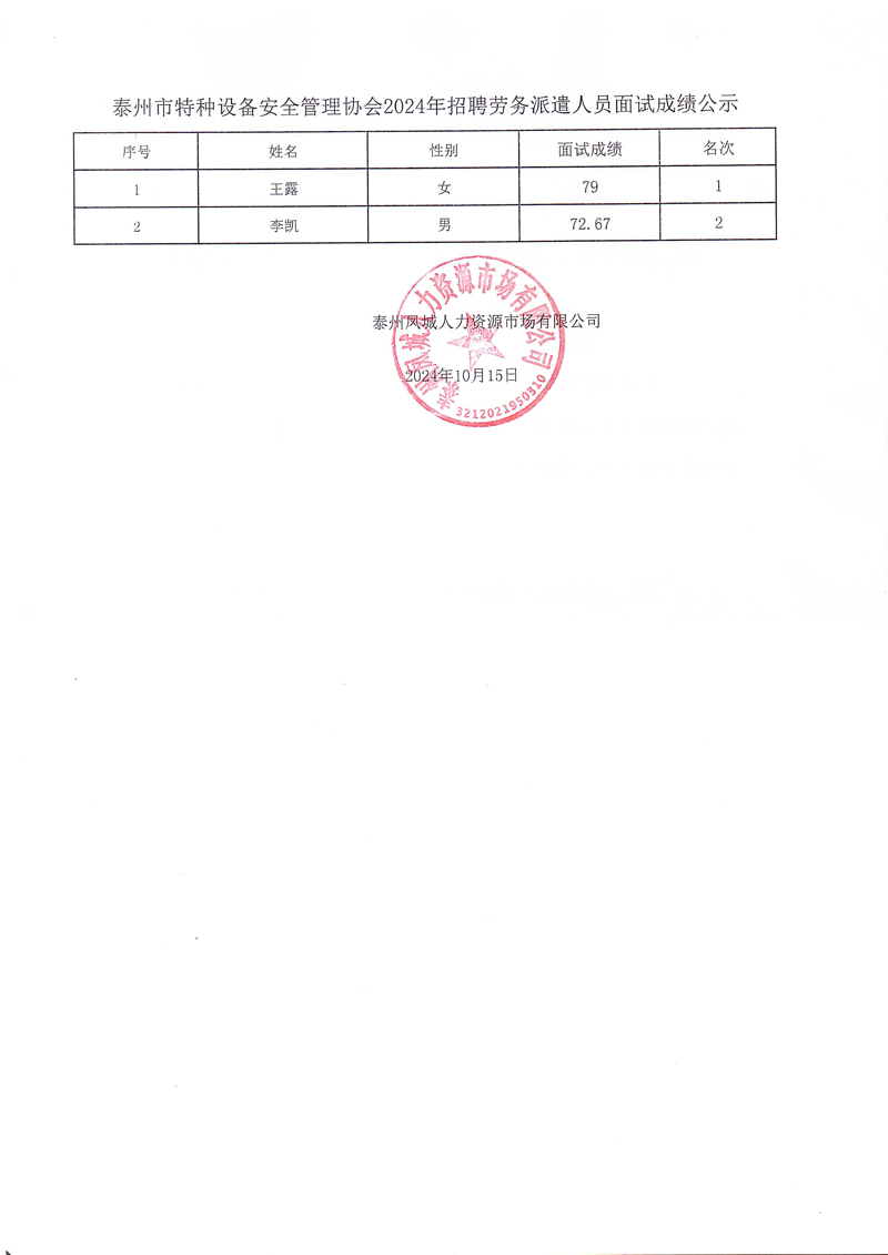 泰州市特種設備安全管理協會2024年招聘勞務派遣人員面試成績公示