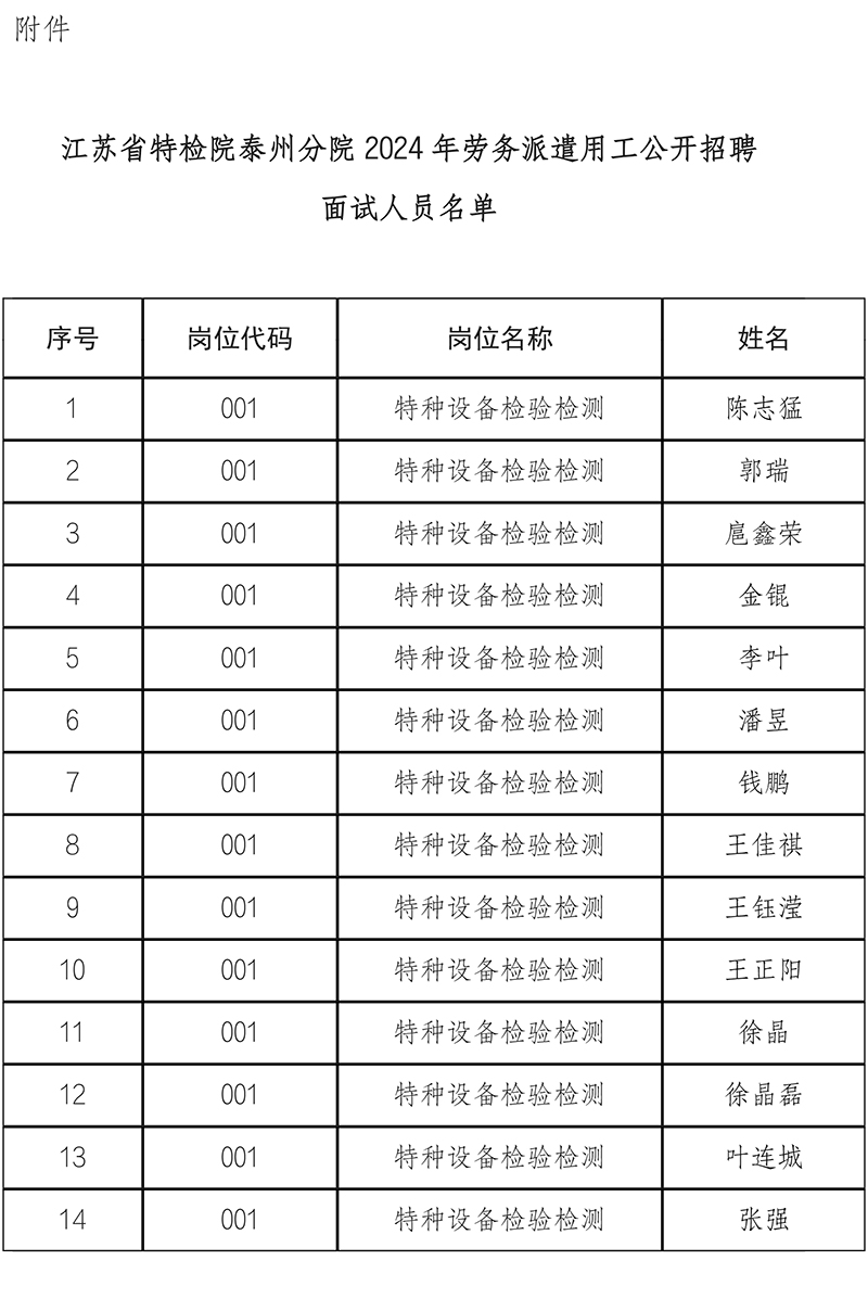 根據(jù)《江蘇省特種設(shè)備安全監(jiān)督檢驗(yàn)研究院泰州分院2024年勞務(wù)派遣用工招聘公告》,經(jīng)資格審核,現(xiàn)將參加面試人員名單予以公示(名單附后)。面試時(shí)間、地點(diǎn)另行通知。
